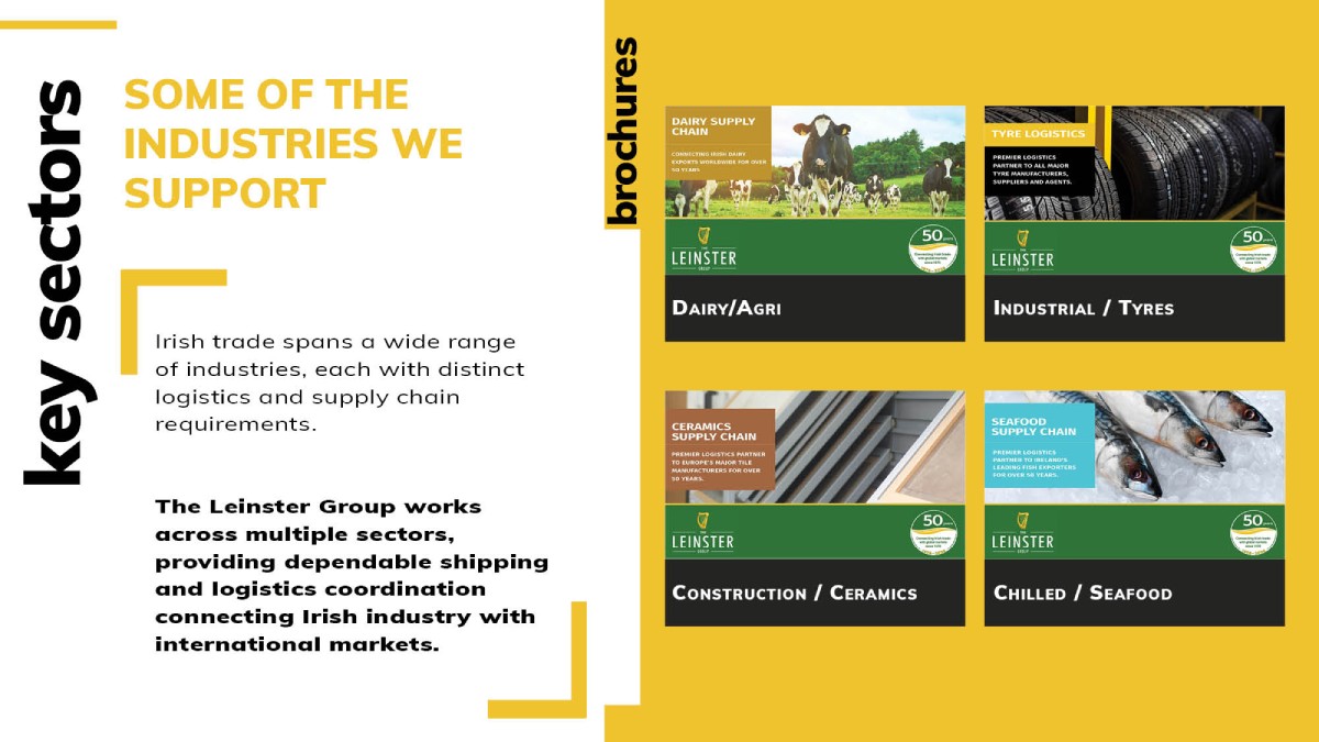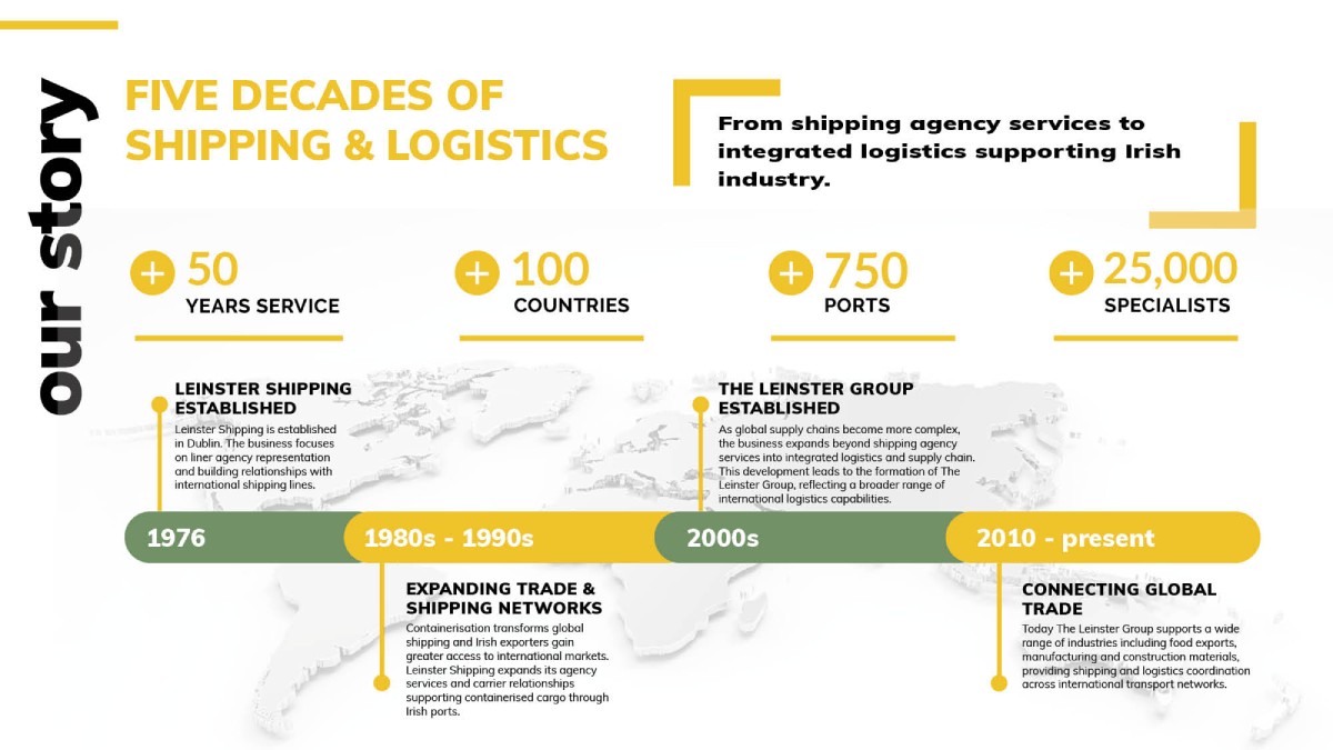 Since its establishment in Dublin in 1976, The Leinster Group has operated at the frontline of Ireland’s export and import economy. Over five decades the company has developed alongside Ireland’s expanding international trade, supporting sectors including dairy, seafood, construction materials, manufacturing and industrial exports.
